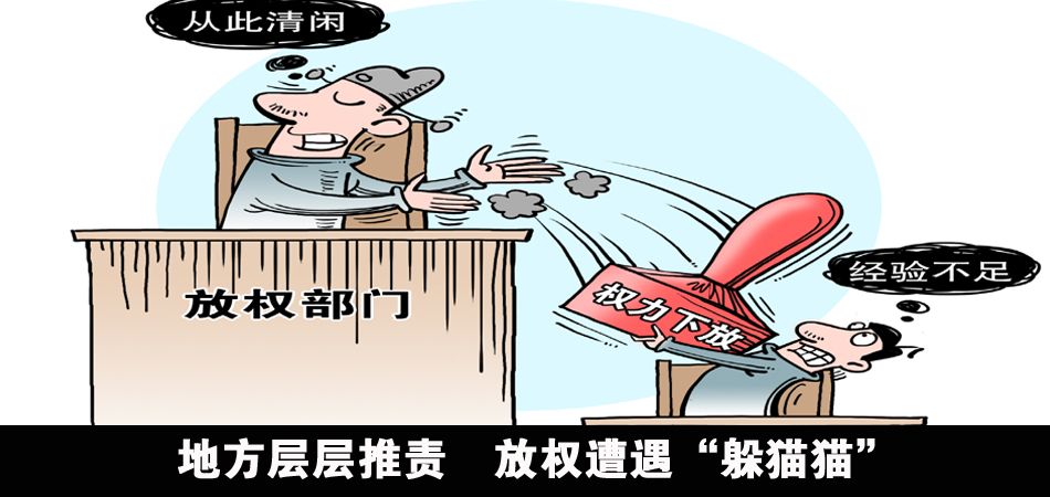 由于怕担责,不少从上头“接权”的部门办事人员常以业务不熟悉为由,对接手的审批事项拖着不办,或是跟上级反复请示,有的还必须要单位一把手签字才能过关。部门之间层层“推权”使得放权被堵在“最后一公里”上,一些企业主苦不堪言。