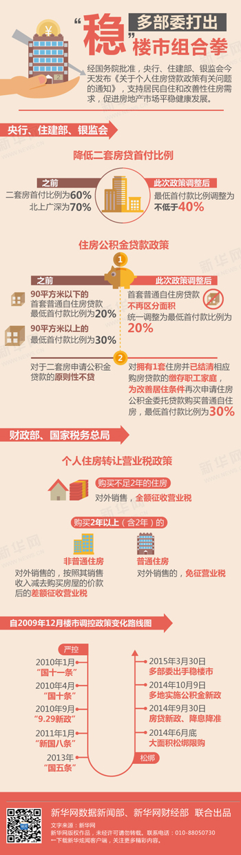 备受关注的“央版”房地产松绑政策正式落地。30日,央行、住建部、财政部、国税总局等部门分别下发房地产新政以稳定楼市增长,包括二套首付降为40%,首套房公积金贷款首付降为20%,二套房公积金贷款首付降为30%;此外,个人出售2年以上住房免征营业税。至此,加上上周刚刚落地的国土部与住建部发布的新政,中央方面对楼市已连下三剂猛药。