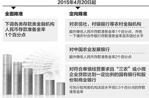 4月19日,央行宣布自20日起下调各类存款类金融机构人民币存款准备金率1个百分点。在此基础上,为进一步增强金融机构支持结构调整的能力,加大对小微企业、“三农”以及重大水利工程建设等的支持力度,自4月20日起对农信社、村镇银行等农村金融机构额外降低人民币存款准备金率1个百分点,并统一下调农村合作银行存款准备金率至农信社水平;对中国农业发展银行额外降低人民币存款准备金率2个百分点;对符合审慎经营要求且“三农”或小微企业贷款达到一定比例的国有银行和股份制商业银行可执行较同类机构法定水平低0.5个百分点的存款准备金率。