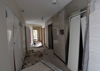 8月13日拍摄的爆炸地点附近的万科清水蓝湾小区受损情况,电梯和门已经被毁坏。 新华社记者 岳月伟/摄 |