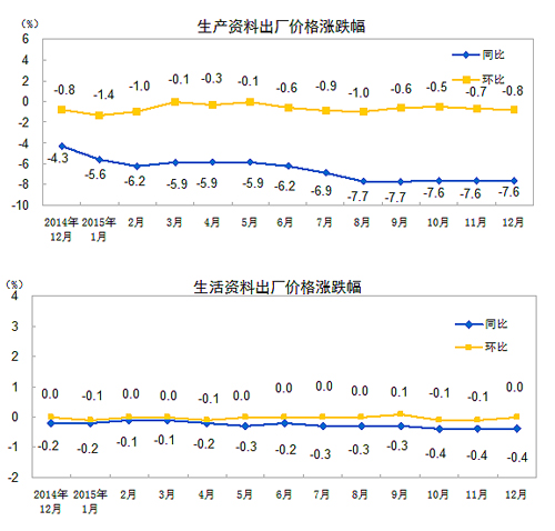 2015年12月份,全国工业生产者出厂价格环比下降0.6%,同比下降5.9%。工业生产者购进价格环比下降0.7%,同比下降6.8%。2015年,工业生产者出厂价格同比下降5.2%,工业生产者购进价格同比下降6.1%。