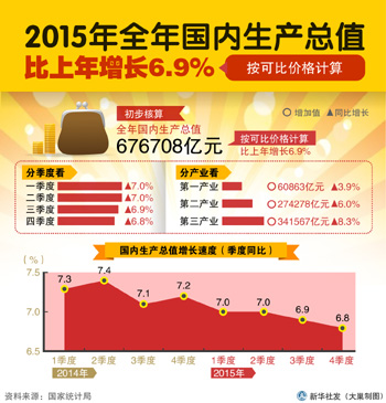 国家统计局19日公布2015年国民经济运行情况。根据初步核算,全年国内生产总值676708亿元,按可比价格计算,比上年增长6.9%,增速创下25年新低。