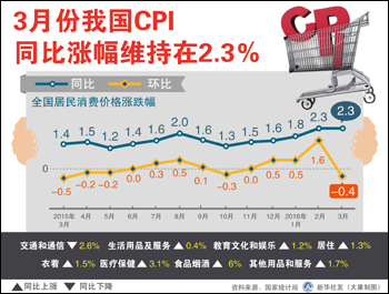 3月物价数据延续了自去年年底以来的回暖趋势。国家统计局11日公布的数据显示,全国居民消费价格指数(CPI)同比上涨2.3%,涨幅继上月后继续维持在2%以上;工业生产者出厂价格(PPI)环比上涨0.5%,这是自2014年1月份以来的首次上涨,同比下降4.3%,降幅继续收窄。