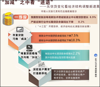 信贷投放领域的变化进一步显现“供给侧改革”的内涵。今年一季度末,产能过剩行业中长期贷款余额同比下降0.2%,首次出现负增长,其中,钢铁业中长期贷款余额同比下降7.5%,建材业中长期贷款余额同比下降10.3%。与此同时,经济重点领域和薄弱环节的信贷投放增长较快。如,小微企业贷款增速为14.5%,比大型企业和中型企业贷款增速分别高2个和5个百分点,高于全部企业贷款增速2.4个百分点。