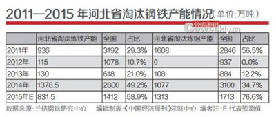 2016年2月4日,国务院发布《关于钢铁行业化解过剩产能实现脱困发展的意见》。意见明确,从2016年开始,在近年来淘汰落后钢铁产能的基础上,用5年时间再压减粗钢产能1亿~1.5亿吨。兰格钢铁研究中心研究员徐莉颖向《中国经济周刊》记者介绍,截至2015年底,河北省钢铁产能约在3亿~3.2亿吨。参考河北省“十三五”产能控制目标为2亿吨,也就是在不新增任何产能的前提下,河北省从今年开始到2020年之前将要淘汰1.2亿吨的钢铁产能。如果完成,那么全国压缩1亿~1.5亿吨产能的任务目标完成毫无压力。