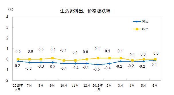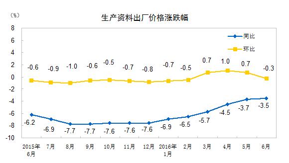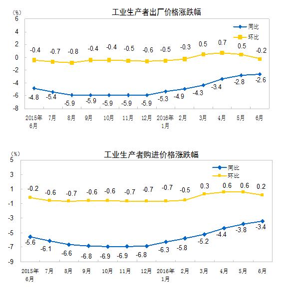 2016年6月份,全国工业生产者出厂价格环比下降0.2%,同比下降2.6%。工业生产者购进价格环比上涨0.2%,同比下降3.4%。上半年,工业生产者出厂价格同比下降3.9%,工业生产者购进价格同比下降4.8%。
