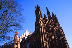 圣安娜教堂是维尔纽斯众多教堂中有代表性的一个,也是立陶宛最著名的哥特式建筑。这座小巧的教堂高只有22米,宽也只有10米,但砌教堂外墙却用了33种不同形状的红砖。教堂结构也颇为复杂,顶端既有主塔,又有若干个小捧护,如众星捧月。远望去,圣安娜教堂就像是一个由线条和角塔构成的美丽童话。相传,拿破仑东征沙俄时路过此地,被圣安娜教堂的精美所吸引,曾想将它“放在手掌中带回巴黎”。