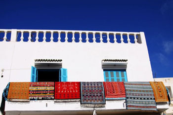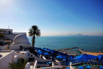 突尼斯海湾的边上静静的蓝白小镇,在透明的阳光中呼吸出了浪漫的色调,这里被誉为“小圣托里尼”。之所以称它为“蓝白小镇”,是因为这个坐落在地中海边峭壁上的镇子,所有的房屋只有两种颜色,白色的墙,蓝色的门窗。如此单纯,却是如此美丽。整个小镇是沿山势蜿蜒而上的,布局很简单,一条鹅卵石铺就的街道,两边是在阳光下闪闪发亮的白色房屋,也有些小巷从屋子内伸出去。房屋都只有二三层高,最让人感觉仿佛置身于童话的,是那白色墙上镶嵌着的蓝色的铁窗和蓝色的木门。阿拉伯式的蔓藤涡卷展现在铁窗窗棂,对称而迷幻;木门上半部的穹顶代表着清真寺的建筑,门上的蓝色铜钉则拼合出星星和月亮,还有弓箭、花卉等伊斯兰图案,华丽而精美。