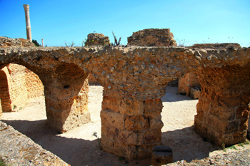迦太基古城罗马时代的遗迹残存较多。罗马人在比尔萨山上建有大神庙,露天柱廊上则保存有罗马在迦太基最杰出的胜利神和丰收神的雕像。著名的公共浴场则是在公元145年-162年间罗马皇帝安东尼时期建成的,是古罗马的第四大浴场。从基部残存的柱石、断墙、拱门可隐约看出两边对称排列的一间间浴室,浴室有更衣室、冷水室、温水室、蒸汽浴室、按摩室、健身房等。浴场用水则从远处的山泉通过60公里长的引水渡槽引来。渡槽高6米-20米,至今仍遗存数段渡槽和支架。