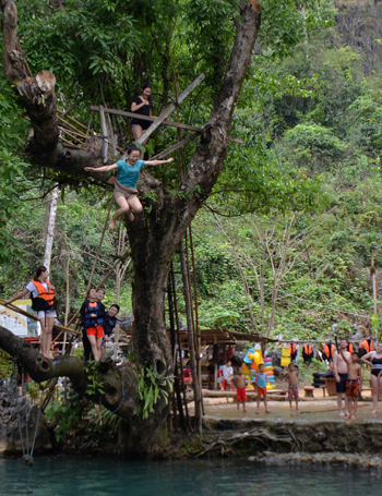 湖边有一根大树,人们在伸向水面的树枝上系上绳索,游客就可以利用这绳索荡向湖水。还有人会直接站在枝丫上,来个跳水动作,落入水中。一般游客的落水只能博得各路美女哈哈大笑,而本地有的小男孩则个个是“跳水王子”,每个动作都轻盈美妙。