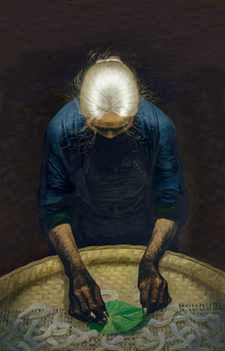 不同于《父亲》通过对人物五官、神态细致入微地描绘,来达到震撼人心的效果,《春蚕》将母亲的银发作为重点的超写实部分,光源自上而下透射,一丝一缕的银发闪闪其灼,质感蓬散却不轻浮,厚重却不呆板,在光线的烘托下明暗有致,栩栩如生。艺术家淡化了人物面部的处理,从侧面反映出母亲含辛茹苦的人生历程:低眉垂眼间,皱纹布满额头,衣衫褴褛下露出一双黢黑、苍老的手。从上至下纵观整件作品,由深及浅,由黑到蓝灰,渐变至簸箕中的蚕的纯白,画面单纯洗练,过渡行云流水。艺术家在作品中还运用对比来彰显感情的张力:饱经风霜的手边,是象征新生与希望的桑叶,是充满生命力的春蚕;瘦削的、骨节分明的手与丰满的春蚕也具有强烈的冲击力,这些苦心经营的构图布局与安排,使观者不得不为之动容。