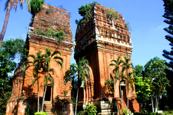 位于市中心的双塔则别有一番味道。在树木三三两两、摩托车拥挤的街道一侧,忽然有一座很小的公园,有几棵秀直的大树,绿叶葱茏,掩映之下是两座平行的垂直黄砖古塔。这两座塔一南一北,始建于11世纪,是古代占婆王国的文化古迹。北塔雕刻着龙的图样,象征越南皇室文化;南塔略低略小,代表子民。现在看来还是很古朴的砖据称是水泥加上树的汁液浇筑而成,结实稳固,因此历经时间变迁也没有变色。从前双塔所在地是祈祷之地,人们通过火烧仪式求神,如今它就像一座街心小遗迹公园,自然是体会归仁这座城市的地标去处了。