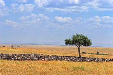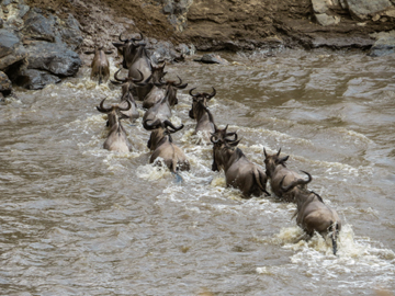 在东非坦桑尼亚的塞伦盖蒂草原和相邻肯尼亚的马赛马拉草原,每年有超过100万头黑尾牛羚 (角马)、15万头斑马和35万头瞪羚,从原本散居的塞伦盖蒂草原南部,不约而同地辗转来到邻国肯尼亚的马赛马拉草原。但面积只有塞伦盖蒂约1/8的马赛马拉草原并不足以维持过百万头外来动物的生活,于是在马赛马拉生活一两个月后,于11月短雨季来临前,动物又千里迢迢的折返,重回塞伦盖蒂草原,开始一个新的迁徙。如此循环往复,年复一年,周而复始。有人计算过,动物在一年中共会行进3000公里,途中危机四伏,历尽生老病死,有多达一半的牛羚会在途中被猎食或因体力不支而死。但同时间亦有约40万头牛羚在长雨季来临前出生,为无休止的艰苦旅程增添生气。