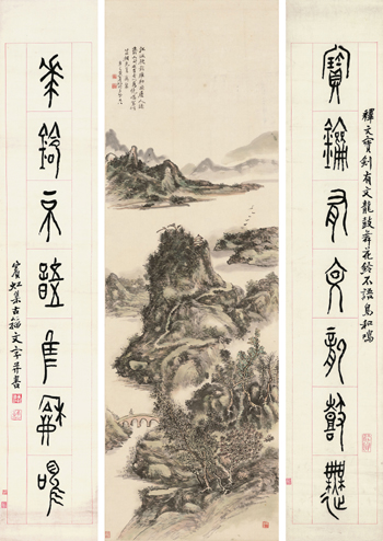 黄宾虹 《秋山策杖图·篆书七言联》 |