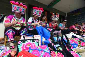 7月16日,彝族绣娘在云南省楚雄市彝人古镇绣制服饰。当日,60多名彝族民间绣娘汇集到彝人古镇,参与“指尖上的技艺”彝族刺绣动态展示活动。记者 杨宗友 摄 |