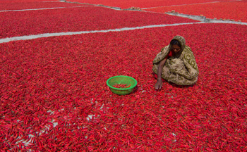 7月13日,在孟加拉国北部博格拉,当地农民晾晒收获的红辣椒。新华社/西霸 |