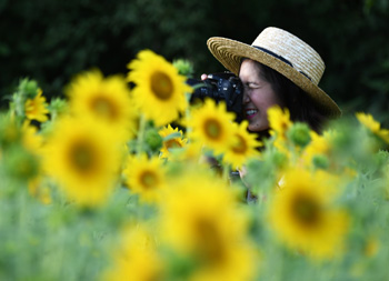7月16日,在美国马里兰州的麦基·贝希尔野生生物管理区,一名游客拍摄向日葵。记者 殷博古 摄 |