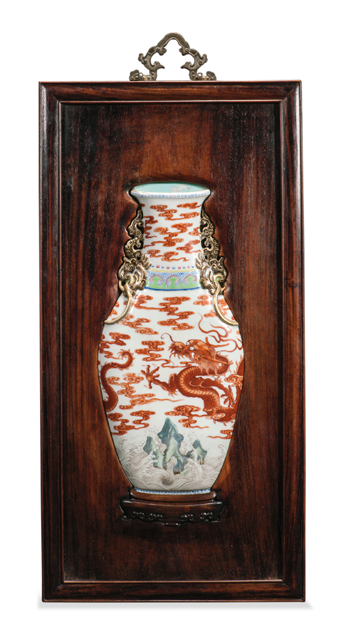 另一件矾红洋彩龙纹壁瓶则是专门为壁面装饰制作的。瓶身扁平,不能容物,但通过巧妙的装饰设计,使之极富立体感,瓶身图样皆略微屈曲变形,瓶颈处的如意云纹尤其明显;瓶口的制作巧妙利用了透视法;两侧以浮雕和镂雕技法作两枚精细古雅的铺首衔环,又涂以金彩,装饰效果极佳,在视觉上也颇有迷惑性,望去真如一瓶。挂于壁上之时,如宝瓶悬空,亦真亦假,可谓有十分匠心奇趣。此瓶釉色也十分优美珍罕,瓶身云龙纹用矾红绘成,发色明艳纯正如朱砂,且深浅浓淡变化多端,令人有“朱分五色”之感,五爪神龙飞腾于天际,须爪张扬,昂首吞吐云气,神姿矫健气势撼人,极具天家风范,鳞片、须爪纤毫毕现,且阴阳向背、质感动态皆分明可观,绘者功力不俗。近底足处用洋彩绘江崖海水,笔触细腻,呈色柔丽。碧海之中惊涛骇浪,中央山崖耸立,青绿嶙峋,一动一静之间,海浪扑打飞珠溅玉之情态、山崖高屹岿然不动之气派,皆呼之欲出,令人观之若有风声在耳,海雾扑面。瓶颈处饰以洋彩如意云头纹,又点缀一圈红蓝连珠,如美人颈上带璎珞,更添风姿,设色清丽柔和,与底部的洋彩江崖海水遥相呼应,也使整器之配色更加和谐。
