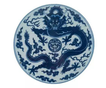 清乾隆青花跃龙捧寿海水折沿大盘。该盘敞口,折沿,弧壁,盘心双弦线内绘五爪苍龙一只,捧寿字跃然凌于祥云之间。内壁为四组飞云腾龙,绕盘心一圈,气势磅礴。大盘折沿处饰青花海水纹一周。外壁沿圈足绘江崖海水纹一周。整器画风雄浑,威严霸气。各组纹饰之间过渡自然,又相互关联,远观彷佛海水澎湃扑打江崖之上,飞龙旋动游走祥云之间,气韵生动,风格华丽。大盘釉汁肥厚莹润,抚之敦和如玉。同类式样的大盘始见于元代,与中亚陶器及金属制大盘十分相似,应为当时元蒙及中亚伊斯兰民族传统宴饮器皿形制的移植。至永宣时期,郑和下西洋通商,这种青花折沿大盘为贸易而定烧,甚为流行。清朝沿用此种大盘形制,多用于皇宫席宴及特定隆重场合。从底款的风格看为乾隆早期,由当时督窑官唐英监制烧造。大盘的主题纹样是跃龙捧寿,与北京故宫藏清乾隆青花龙首纹螭耳六方瓶、清乾隆黄地青花跃龙捧寿纹六方瓶一样,皆为当时督窑官唐英亲自画样,这种纹饰的瓷器是专用于庆祝皇帝御寿,是万寿级别的官窑极品。