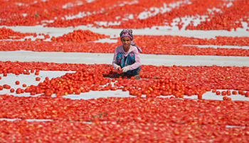 8月2日,在土耳其伊兹密尔,工人把番茄切开放在太阳底下晒成番茄干。新华社/欧新 |