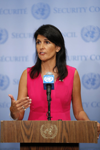 8月25日,在位于纽约的联合国总部,美国常驻联合国代表妮基·黑莉向媒体发表讲话。黑莉说,国际原子能机构应“倾尽其职权”对伊朗核设施进行检查,并表达美国对这一进程的支持。记者 李木子 摄 |