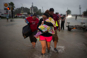 8月28日,在美国得克萨斯州休斯敦,人们从家中撤离后转移到高地。截至当地时间28日晚,至少11人在飓风“哈维”引发的灾害或事故中死亡。随着休斯敦地区积水面积不断扩大,近6000人主动前往或被营救至临时避难所。新华社/路透 |