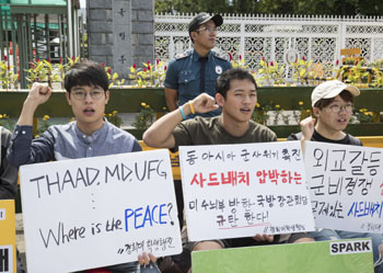 8月29日,在韩国首尔,民众手举反对部署“萨德”的标语抗议示威。韩国民众29日在位于首尔的韩国国防部前举行反对部署“萨德”系统的集会。新华社发(李相浩 摄) |