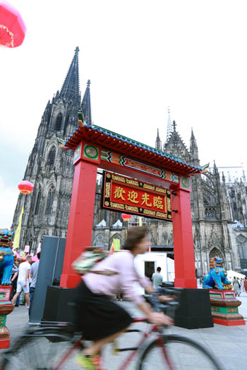 8月26日,人们在德国科隆大教堂前举办的中国节上游览。第三届科隆中国节于8月25日至27日在科隆大教堂广场举行。北京老字号特色商品展卖、老字号传统技艺现场展演、“魅力北京”旅游图片展等活动让德国民众与中国文化进行了一次亲密接触。记者 罗欢欢 摄 |