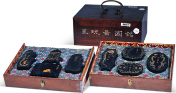 “研濡生香”此次汇集笔、墨、纸、砚文房四宝,另有印章及文房诸器。这其中仍以砚为主,汇集端、歙等各类砚材,有以佳材取胜者,亦有文人砚以供选藏。在此基础上,此次着力提高了其他文房用器的品质。墨类中以“清嘉庆御制铭园图墨八方”尤为突出,同时为玛丽及庄智博旧藏,递藏清晰。同时,还有一批日本同一私人收藏纸笺,其中包括红地描金笺纸、夹刻笺及虎皮宣等诸多类别,均为藏家20世纪六、七十年代购自荣宝斋。印章类中,“潘天寿自用田黄长方印”印料考究,纹理清晰,十分难得。文房诸器中包括铜、竹、木等诸多类别,其中“清早期铜洒金铺首尊”体量硕大,洒金亮丽自然,款识挺立。