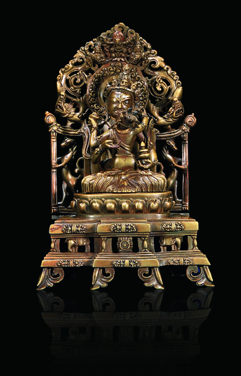 “玉器工艺品”专场中,以玉器开场,甄选牌、佩、山子、炉、屏等不同玉质,各式器型的拍品,以供选藏。其中“清乾隆白玉留皮朝冠耳兽足炉”尤为突出,玉质莹润,玉色洁白,选料较大,掏膛爽利,加之兽足寥寥数刀,生动逼真,颇为添色。佛教艺术品一类亦是本专场的重点,其中不同时期的金铜造像,即有宫廷风格,又有西藏风格等。其中“清乾隆铜鎏金财宝天王像”为乾隆宫廷造像,铸造生动,錾刻清晰,实为藏奉首选。另外,“清乾隆合金铜白上乐金刚像”亦十分突出,反映了乾隆宫廷在佛造像中的慕古风格,表现出清廷对于西藏所供古代风格造像的推崇,作品遵循经典的印度样式,宝座及背光均颇具特色。