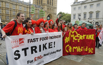 9月4日,英国部分麦当劳员工举行罢工,以期提升薪资水平、改善工作条件。这是麦当劳在英国开业以来首次发生罢工事件。新华社/法新 |