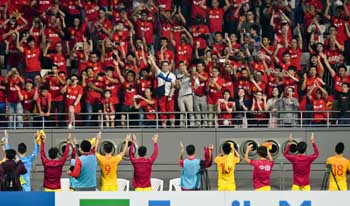 9月5日,在卡塔尔首都多哈进行的2018年世界杯足球赛亚洲区预选赛中,中国队以2比1战胜卡塔尔队。图为中国队球员赛后向球迷致意。新华社发(尼库 摄) |