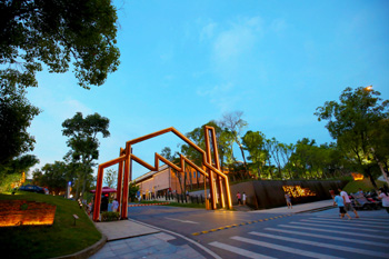 老瓷厂的烟囱是广场的灵魂,它静静伫立在波光粼粼的水面之上,俯视着人们三五成群,或走进对面的美术馆,或钻进身后的“猫空”书店,或在溪边的长椅上静静享受清风暖阳……夜里,广场换上艳丽的“晚妆”,灯光把水面映射得炫彩梦幻,音乐节、动漫趴、街舞秀……青春的欢笑在这里尽情挥洒。
