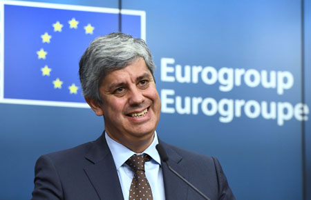 12月4日,在比利时布鲁塞尔,葡萄牙财政部长马里奥·森特诺出席新闻发布会。葡萄牙财政部长马里奥·森特诺在4日的欧元区财长会上当选下一任欧元集团主席,将于2018年1月13日就职,任期两年半。新华社/法新