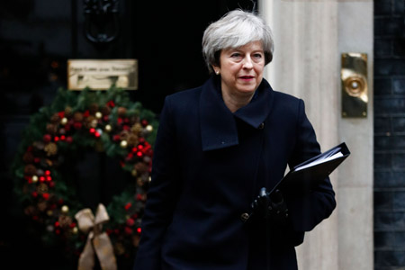 12月11日,在英国伦敦,英国首相特雷莎·梅走出唐宁街10号首相府。特雷莎·梅11日说,英国预计向欧盟支付350亿至390亿英镑(约合470亿至520亿美元)的“脱欧分手费”,但条件是双方未来要达成一份贸易协议。新华社/法新