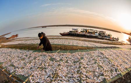 12月8日,在江西鄱阳湖都昌印山附近湖滩,渔民在晾晒凤尾鱼干。连日来,江西鄱阳湖畔鱼干飘香。渔民将捕获的凤尾鱼晾晒,加工成鱼干供应各地市场。新华社发(傅建斌 摄)
