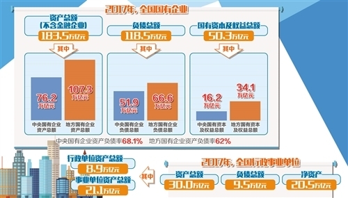 汇总中央和地方情况,2017年全国国有企业资产总额183.5万亿元,负债总额118.5万亿元,国有资本及权益总额50.3万亿元。全国国有企业境外总资产16.7万亿元。