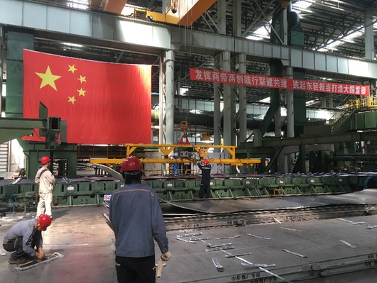 国旗与“两带两创”的条幅挂在生产车间的醒目位置。记者 王淮志 摄