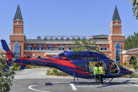 在新疆霍尔果斯旅游集散中心,工作人员为乘坐直升机游玩的旅客做起飞准备。记者 胡虎虎 摄