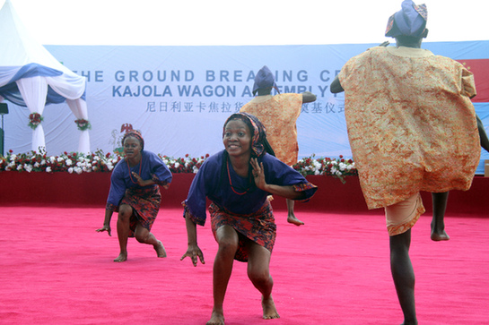 中国土木工程集团有限公司(中土集团)投资建设的尼日利亚首个铁路车辆组装厂9日在尼西南部奥贡州卡焦拉镇举行奠基仪式。图为在尼日利亚奥贡州卡焦拉镇,当地演员在奠基仪式上表演传统舞蹈。