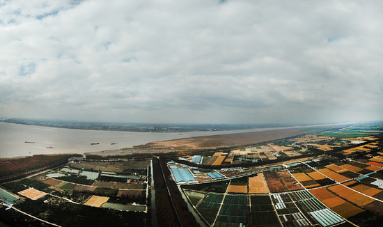长江从崇明岛(前)和江苏省海门市之间流向大海。记者 方喆 摄