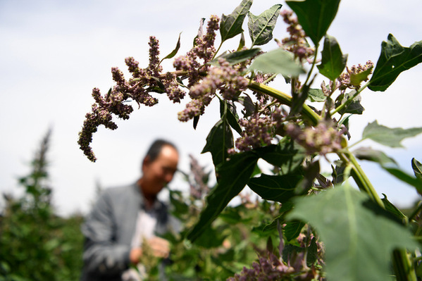 8月2日,天祝藏族自治县松山镇大沟兴农种养殖专业合作社负责人文玉廷在地里查看藜麦生长情况。记者 陈斌 摄