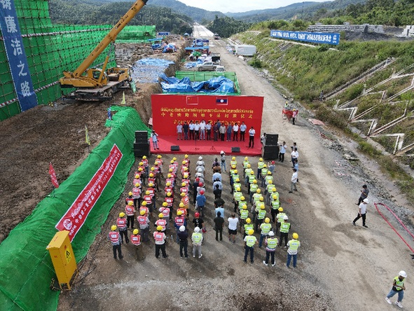 随着最后一方混凝土浇筑完成,由中国中铁建工集团有限公司承建的中老铁路纳堆站主体结构9月16日顺利封顶,这是中老铁路首座封顶的站房工程。图为中老铁路纳堆站主体结构封顶仪式现场。