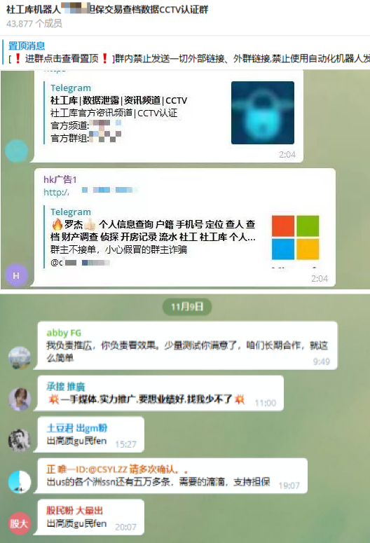 近期,记者在Telegram上一个名为“社工机器人&闲鱼担保交易查档数据某认证群”的社交群上看到,大量的包括户籍、手机号、定位、查人查档、财产调查、开房记录、流水等在内的用户信息被公开售卖,十分猖獗。