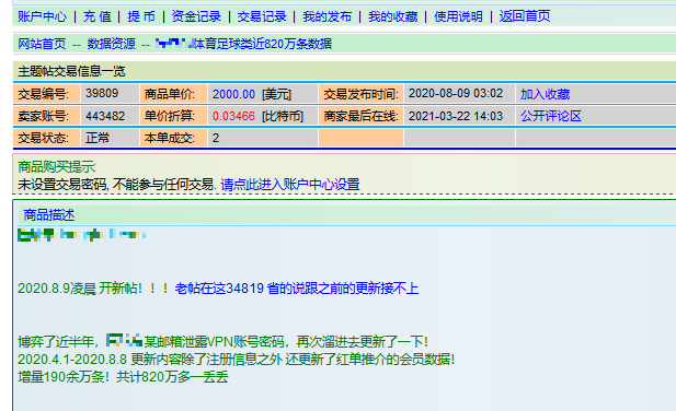 与个人隐私信息售价低廉不同的是,含赌博类会员的信息价格直线上涨。有帖主表示,某体育足球类App邮箱泄露VPN账号密码,除了新增2020年4月1日到2020年8月8日的注册信息外,还更新了红单推介会员数据,增量190万条。值得注意的是,该数据包售价高达2000美元,已有2单成交。