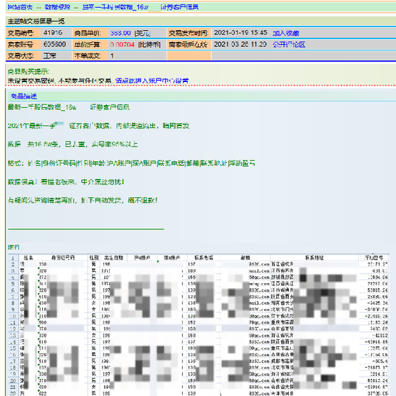 另一个在售的数据包为某证券公司多达16万的客户信息,标价368美元。发帖者表示,该数据为2021年最新一手客户数据,内部渠道流出,暗网首发。“数据一共16.5万条,已去重,实号率95%以上,数据保真。”