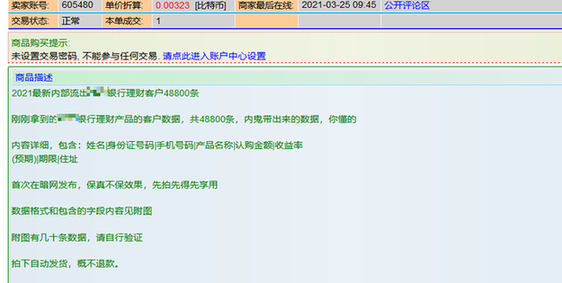 此外,某商业银行的银行卡、理财信息等多项泄露出来的数据被售卖。交易编号为41884的帖子表示,该数据包拥有2021年某商业银行客户数据48566条,内含详细个人信息、银行卡号、银行卡种类多项信息。