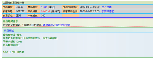 除了黑客等技术人员盗取批量信息之外,也有一些“内鬼”直接参与其中。交易编号为40046的帖子显示:“只要提供身份证和姓名信息,便可代查名下所有银行卡具体信息,不带余额1100美元,结果带余额需2200美元,1-5个工作日即可出结果。”值得注意的是,该贴自2020年8月24日发布以来,目前已交易多达360单。