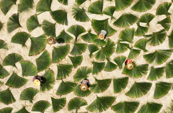 7月6日,在湖南省衡阳市祁东县金桥镇金龙村,村民在晾晒席草(无人机照片)。