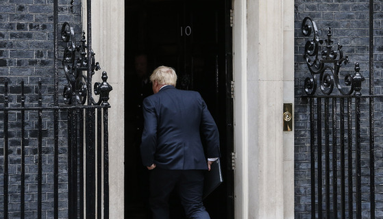 7月7日,英国首相鲍里斯·约翰逊在伦敦唐宁街10号门前发表讲话后返回室内。